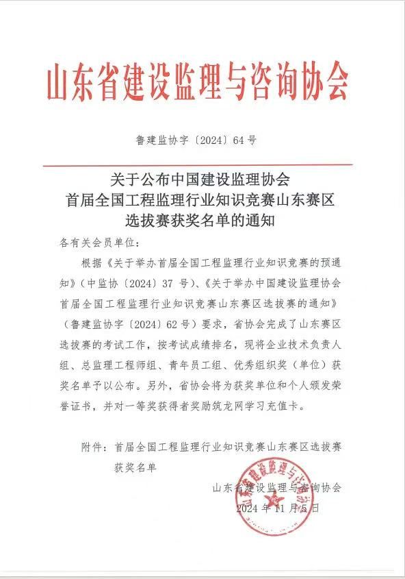 2024年11月5日,山东省建设监理与咨询协会公布了“关于公布首届全国工程监理行业知识竞赛山东赛区选拔赛获奖名单的通知”,在此次选拔竞赛中我环亚(中国)取得佳绩 。